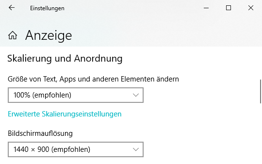 Das folgende Bild zeigt die Einstellmöglichkeit zur Skalierung und Bildschirmauflösung unter Microsoft Windows 10.