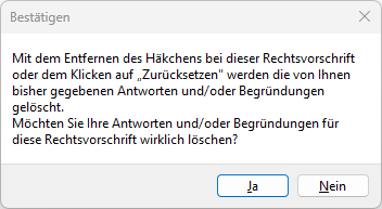 Dadurch werden alle Begründungen zur Maschinenrichtlinie sowie alle Einträge in den Fragen-Anwort-Assistenten in folgenden Registern gelöscht: Relevanz, Anforderungen, Wesentliche Veränderung, Gesamtheit von Maschinen und Konformitätsbewertungsmodul.