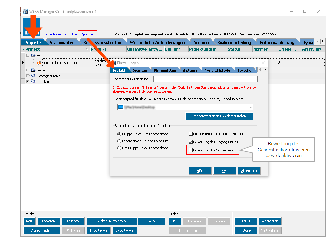 Das Deaktivieren bzw. Aktivieren der Bewertung des Gesamtrisikos umfasst folgende Schritte: