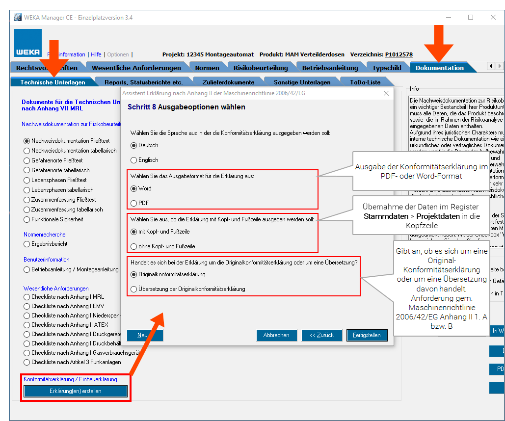 Der Assistent für die Erstellung der Konformitäts- bzw. Einbauerklärung enthält im letzten der acht Schritte mehr Optionen, z. B. zum Einblenden einer Kopf- und Fußzeile.