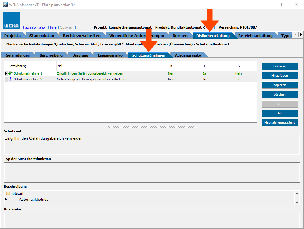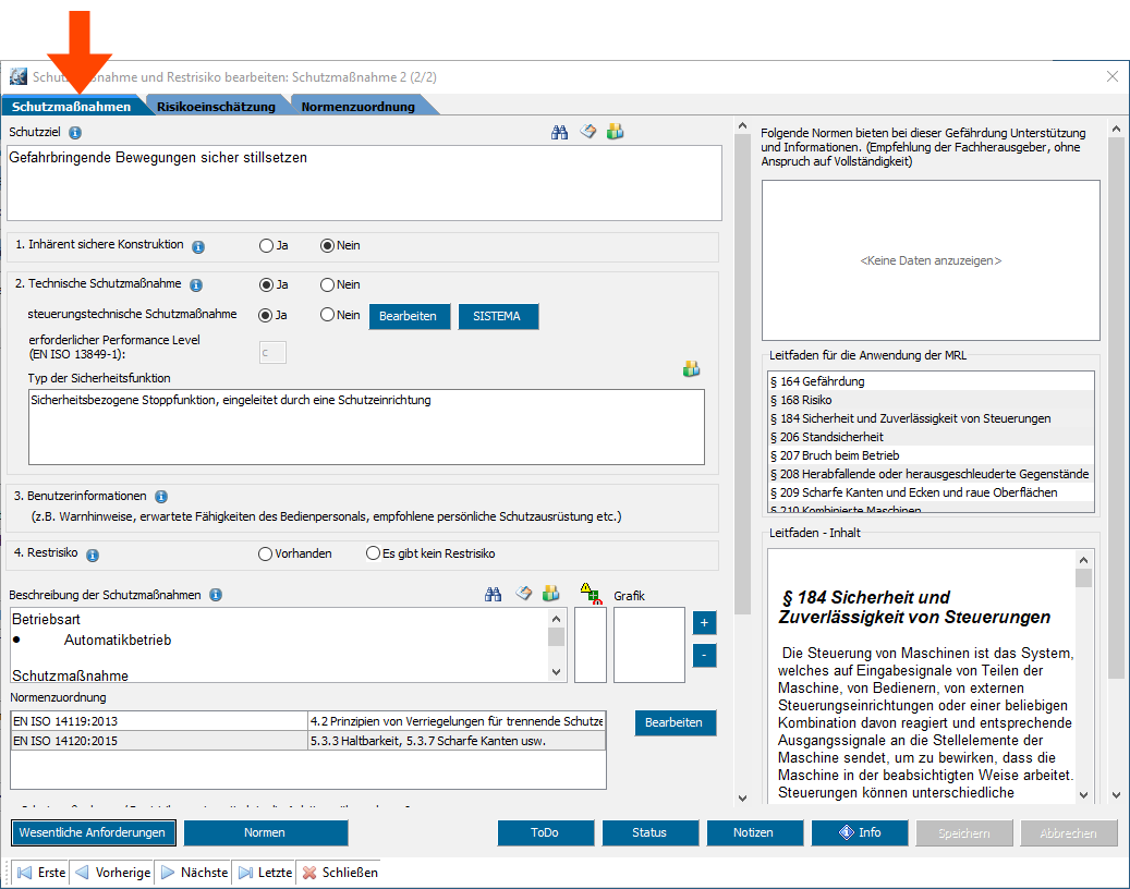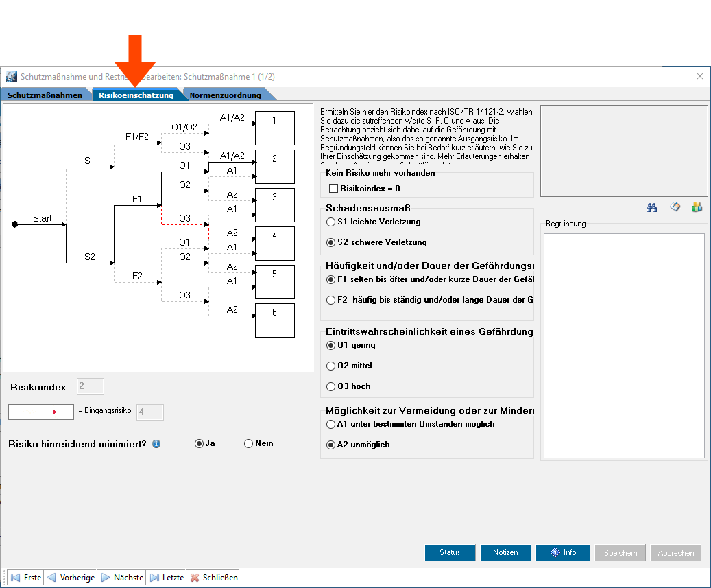 In den Registern Schutzmaßnahmen und Risikobeinschätzung die erforderlichen Informationen eingeben.