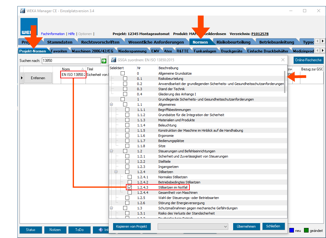 Die Verknüpfung ist nur bei Normen möglich, die zur RICHTLINIE 2006/42/EG DES EUROPÄISCHEN PARLAMENTS UND DES RATES vom 17. Mai 2006 über Maschinen und zur Änderung der Richtlinie 95/16/EG (Neufassung) (Text von Bedeutung für den EWR) harmonisiert sind. Dies sind die Normen unter Register Normen > Maschinenrichtlinie.