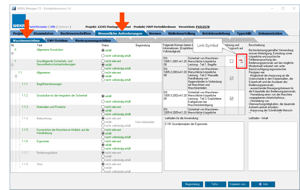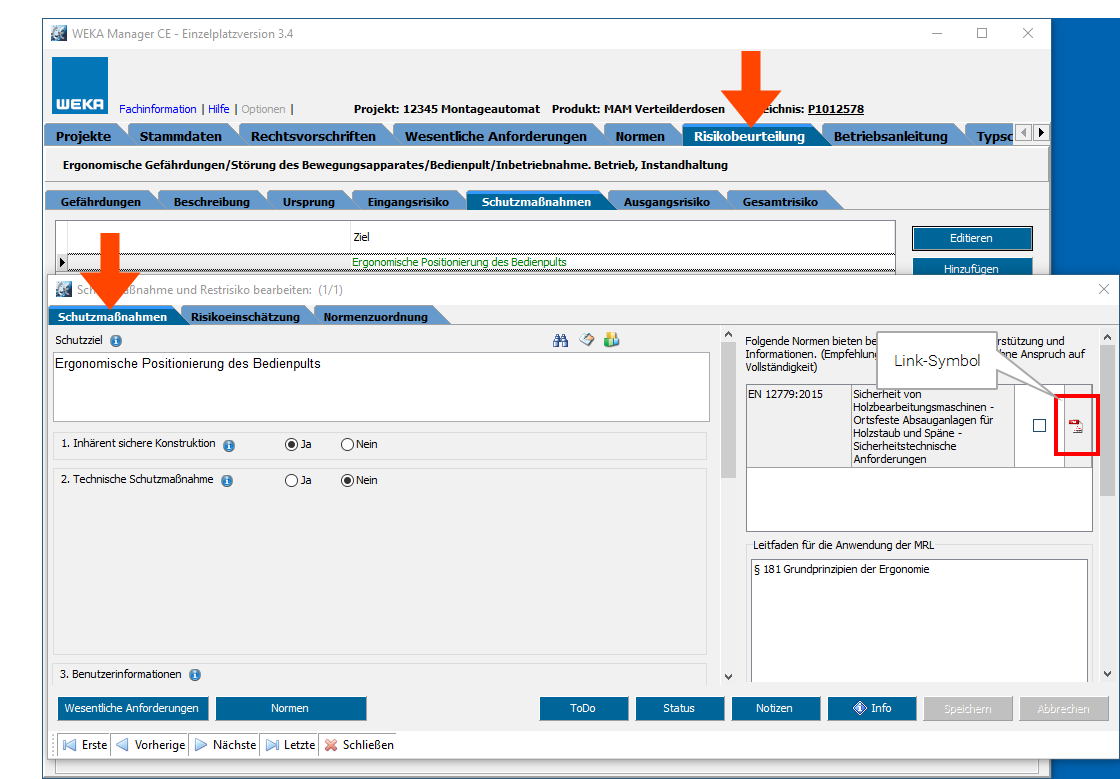 Diese Link-Symbole werden jetzt zusätzlich in den Registern Wesentliche Anforderungen und Schutzmaßnahmen dargestellt.