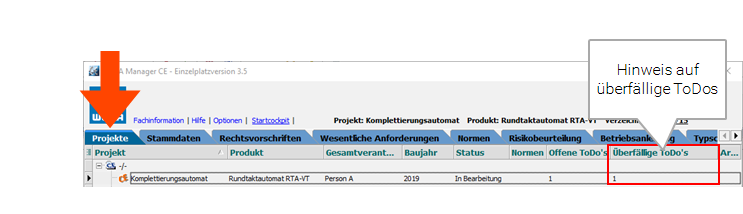 Ist ein ToDo nicht abgearbeitet und wird das festgelegte Datum überschritten, wird in der Projektansicht auf überfällige ToDo´s hingewiesen.