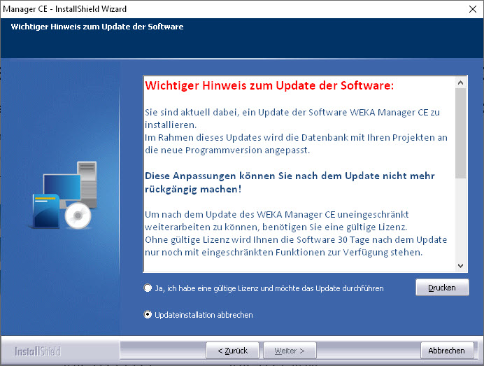Der Hinweis weist u. a. explizit darauf hin, dass die Anpassung der Datenbank an WEKA Manager CE V3.6 nicht rückgängig gemacht werden kann.