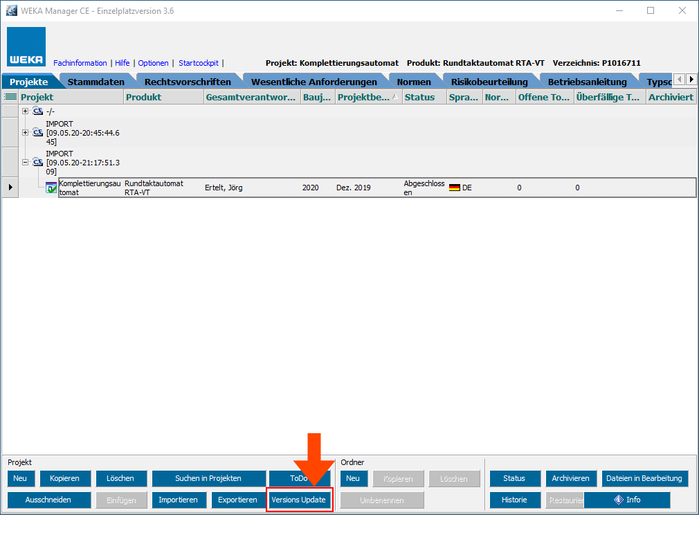 Projekte, die mit älteren Versionen von WEKA Manager CE V3.6 angelegt wurden, können an die neuen Programm-Funktionen in WEKA Manager CE V3.6 auf Knopfdruck angepasst werden.