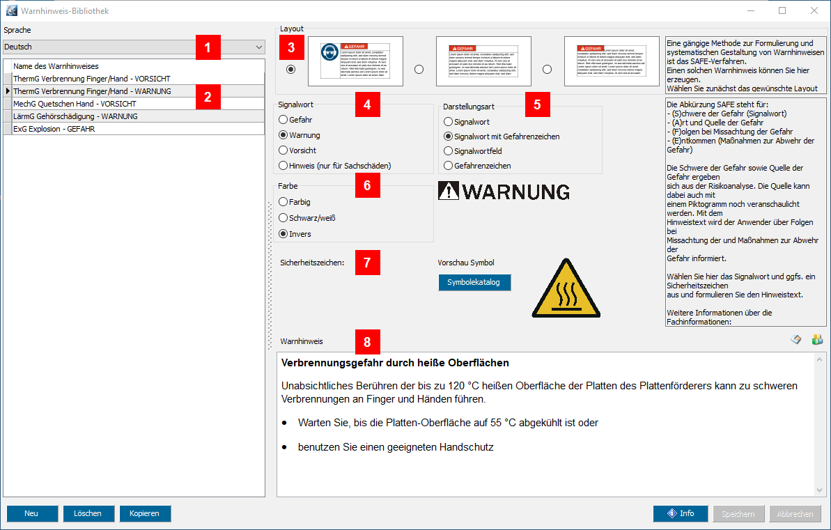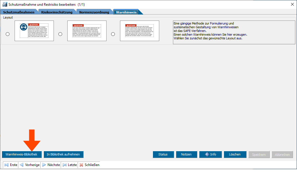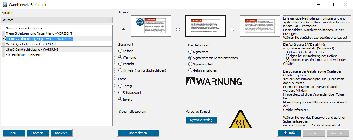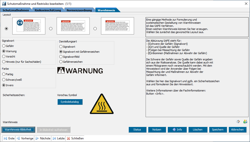 In der neuen Warnhinweis-Bibliothek können Sie Warnhinweise ablegen, die danach in die Risikobeurteilung und in die Betriebsanleitung übernommen werden können.