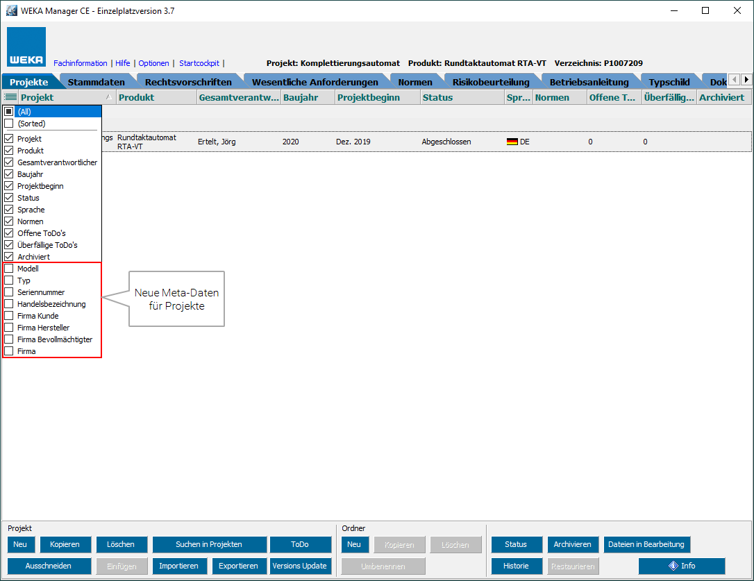 Die Liste mit Meta-Daten wurde erweitert. Meta-Daten werden im Register Projekte bei den Projekten angezeigt.