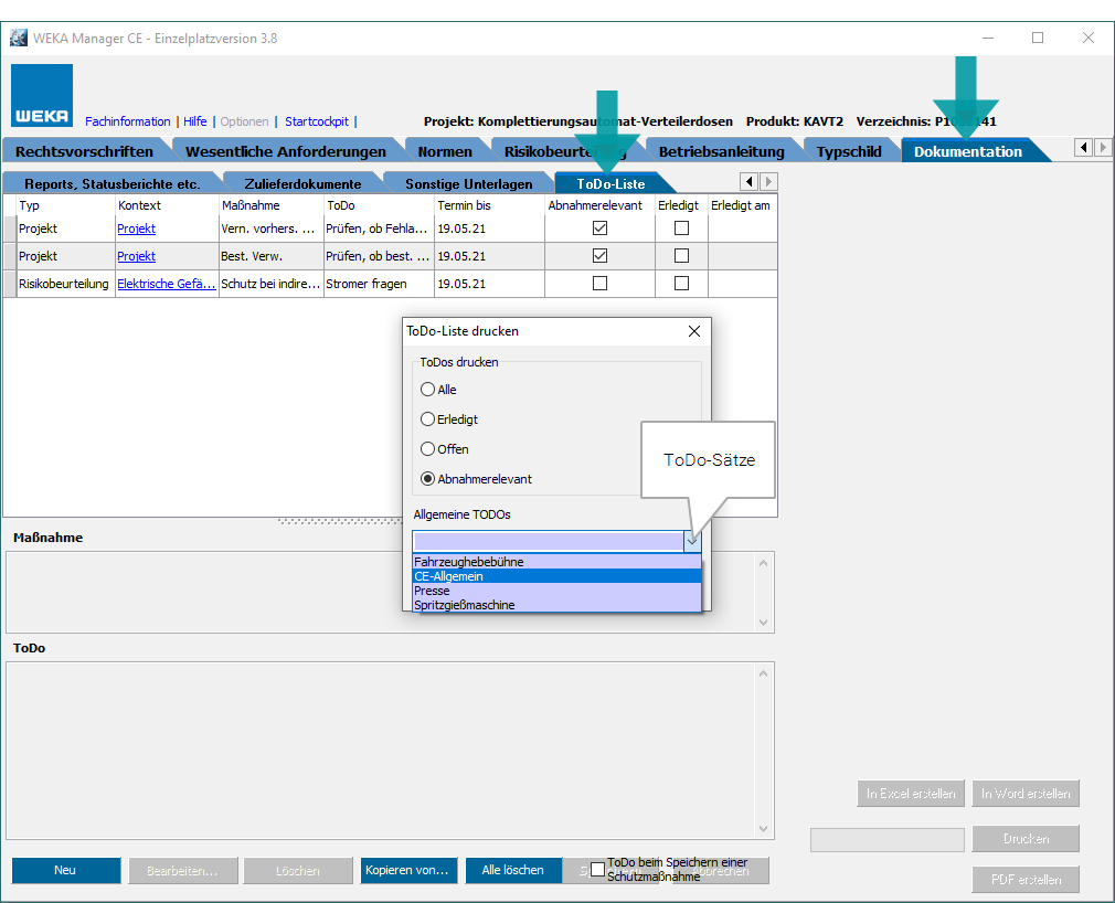 Abnahmedokument ausgeben und allgemeine ToDo´s wählen. Projektspezifische ToDo´s werden automatisch in das Abnahmedokument übernommen.