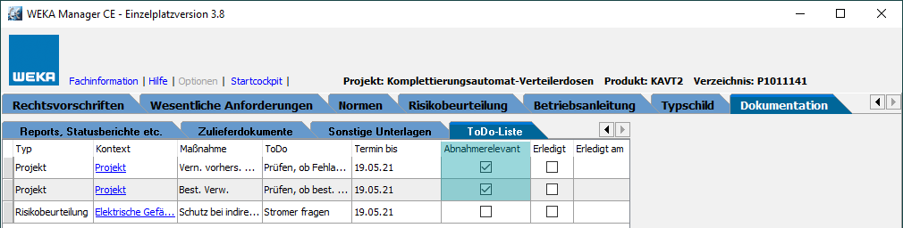 Beim Ausgeben eines Abnahmedokuments werden die projektspezifischen und die gewählten allgemeinen ToDo´s in das Abnahmedokument übernommen.