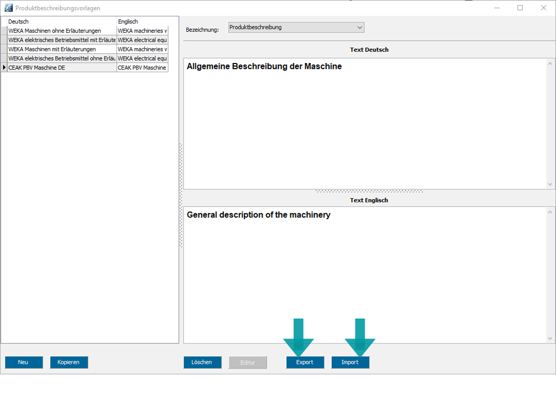Produktbeschreibungsvorlagen: Export bzw. Import