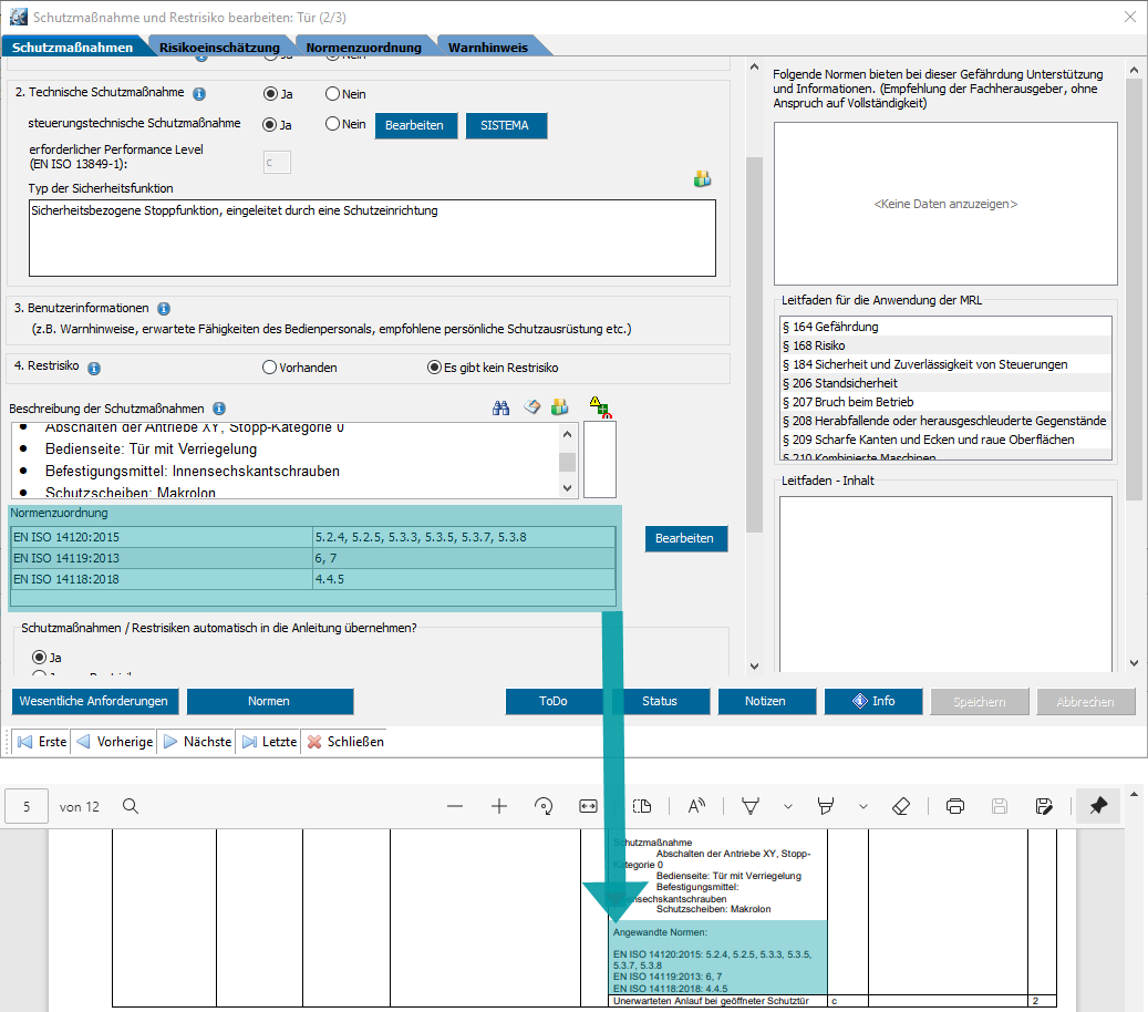Bei der Ausgabe der Risikobeurteilung als tabellarische Nachweisdokumentation werden die zugeordneten Normen samt Bemerkung ausgegeben.