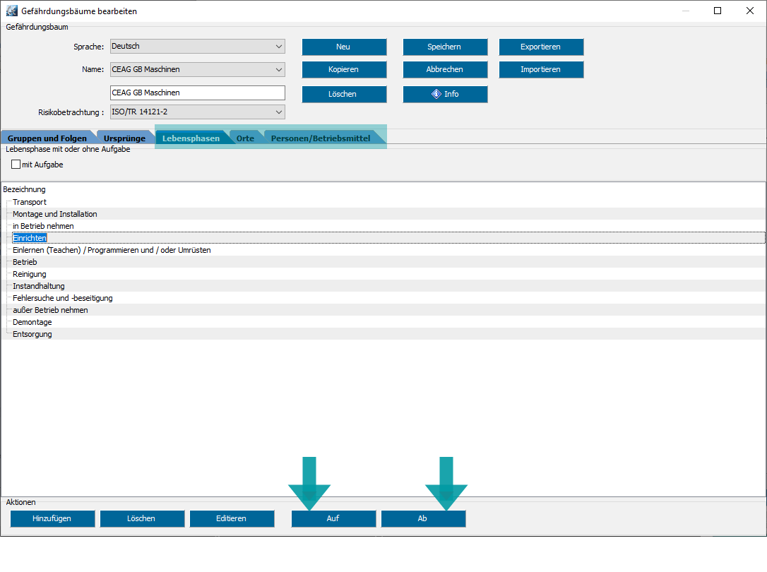 Die auf- und absteigende Sortierung in Gefährdungsbäumen wurde hinzugefügt in den Registern Lebensphasen, Orte und Personen/Betriebsmittel.