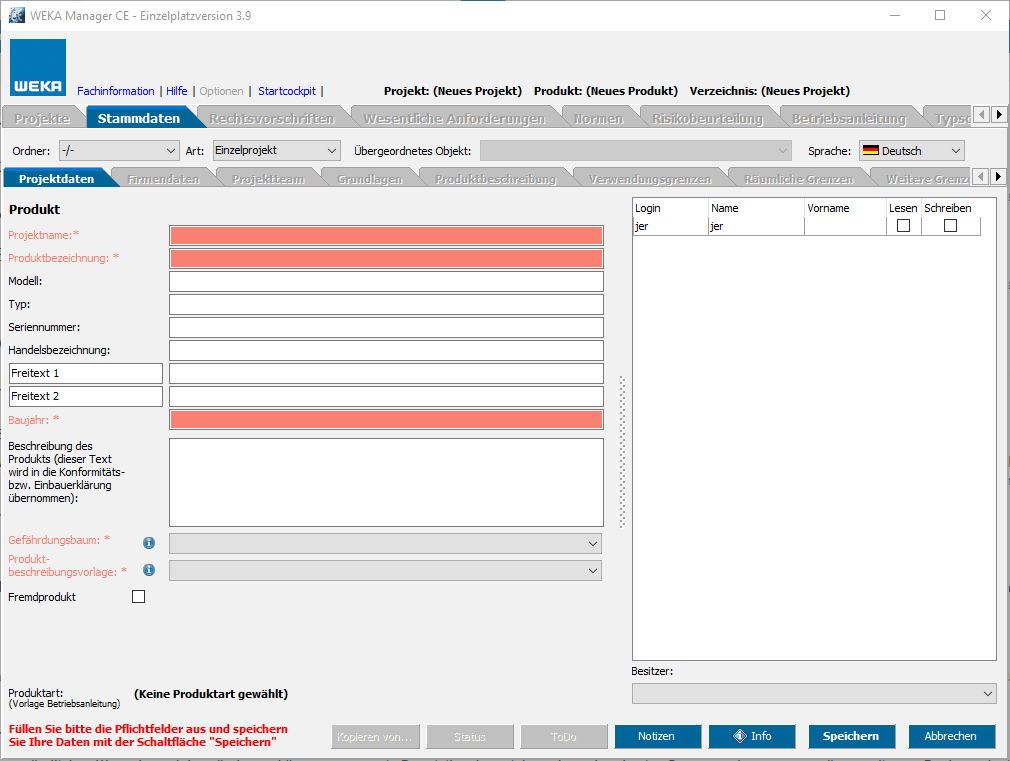 Das folgende Bild zeigt Pflichtfelder beim Anlegen eines Projekts.