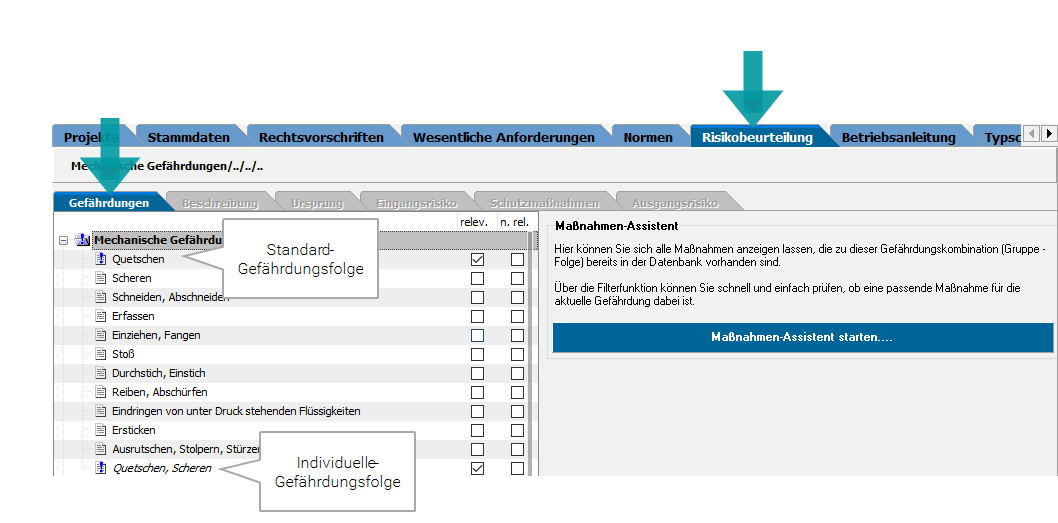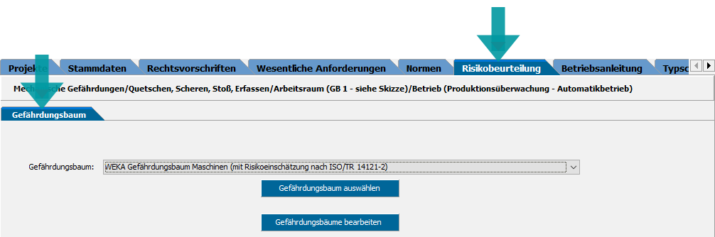 Ab Version 4.0 wird der Gefährdungsbaum im Register Risikobeurteilung gewählt. Zu einem Zeitpunkt also, zu dem die Produkteinstufung im Register Rechtsvorschriften erfolgt ist.
