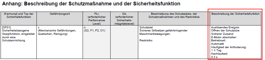 Die folgende Abbildung zeigt die Spezifikation einer Sicherheitsfunktion im Report Funktionale Sicherheit.