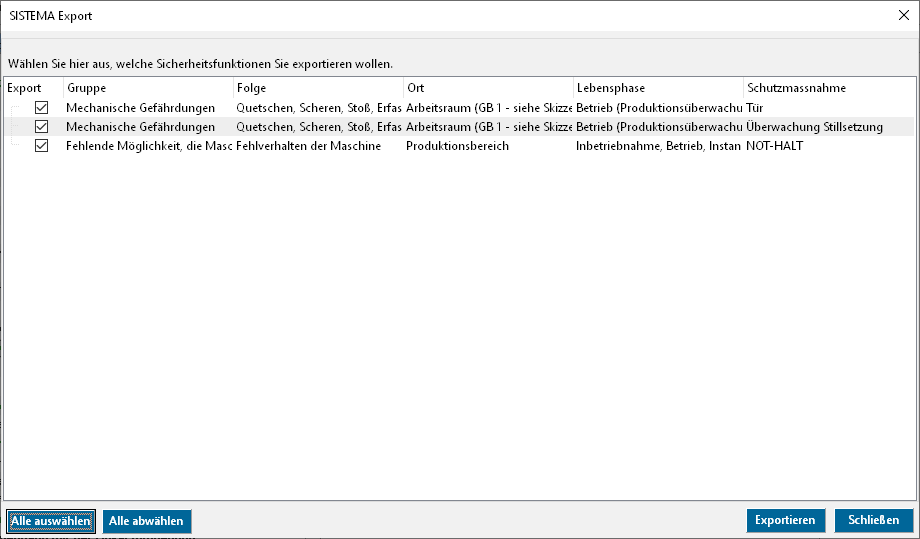 Für die Übergabe aller Sicherheitsfunktionen in einem Projekt an SISTEMA musste der SISTEMA-Button umgezogen werden. Der SISTEMA-Button befindet sich jetzt im Register Risikobeurteilung > Gefährdungen.