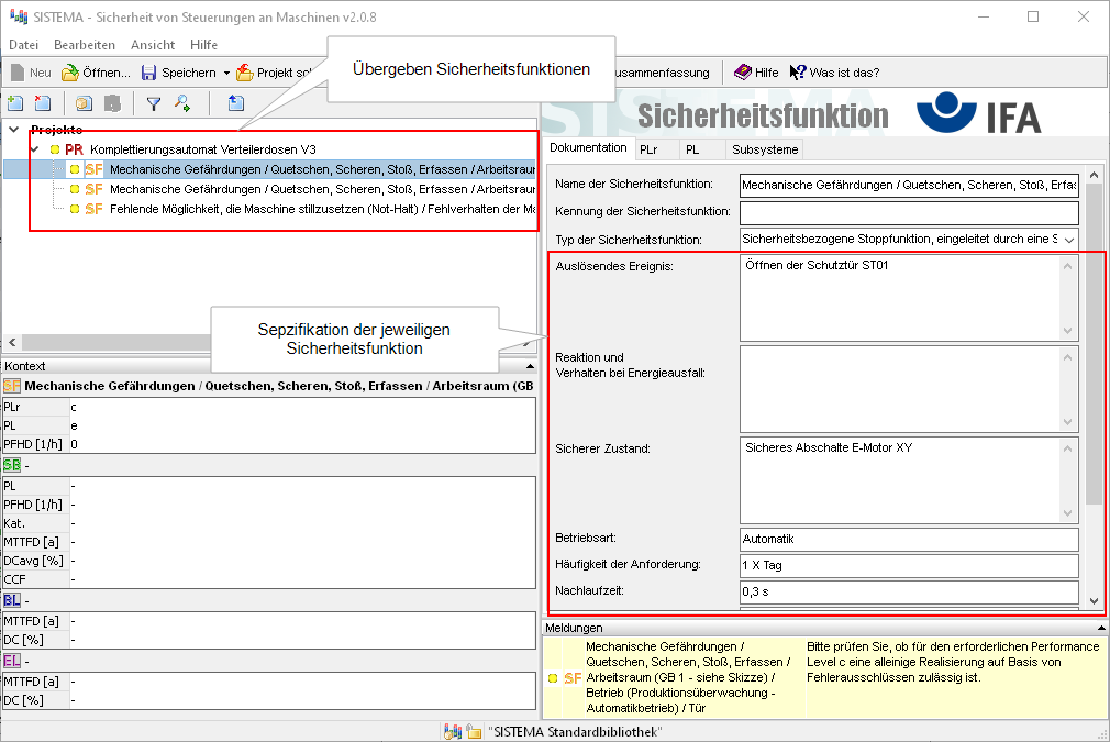 Ab Version 4.1 könne alle Sicherheitsfunktionen in einem Projekt auf einmal an SISTEMA übergeben werden, einschließlich der Spezifikationen der Sicherheitsfunkionen. Die Möglichkeit, Sicherheitsfunktionen einzeln an SISTEMA zu übergeben, wurde beibehalten.