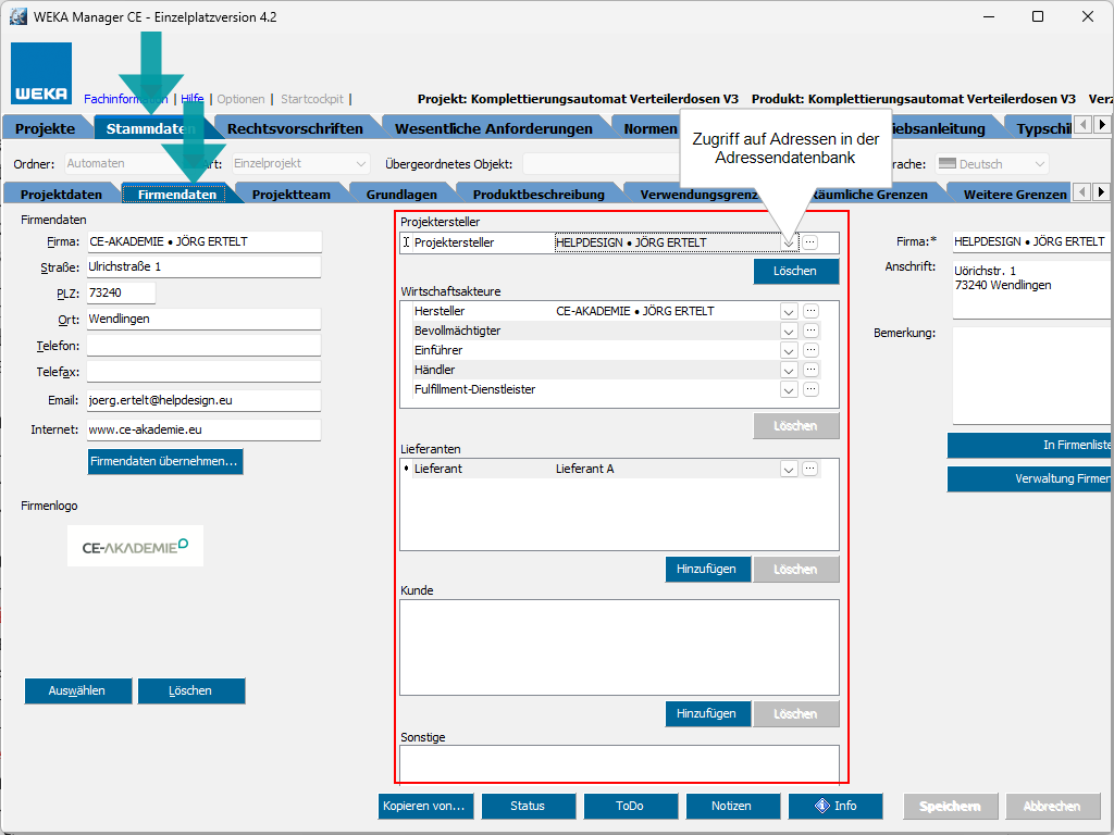 Adressen sind der Dreh- und Angelpunkt bei der Rückverfolgbarkeit im Zusammenhang mit dem CE-Prozess. Adressen identifizieren Wirtschaftsakteure wie Hersteller und Händler sowie Lieferanten, Kunden etc.