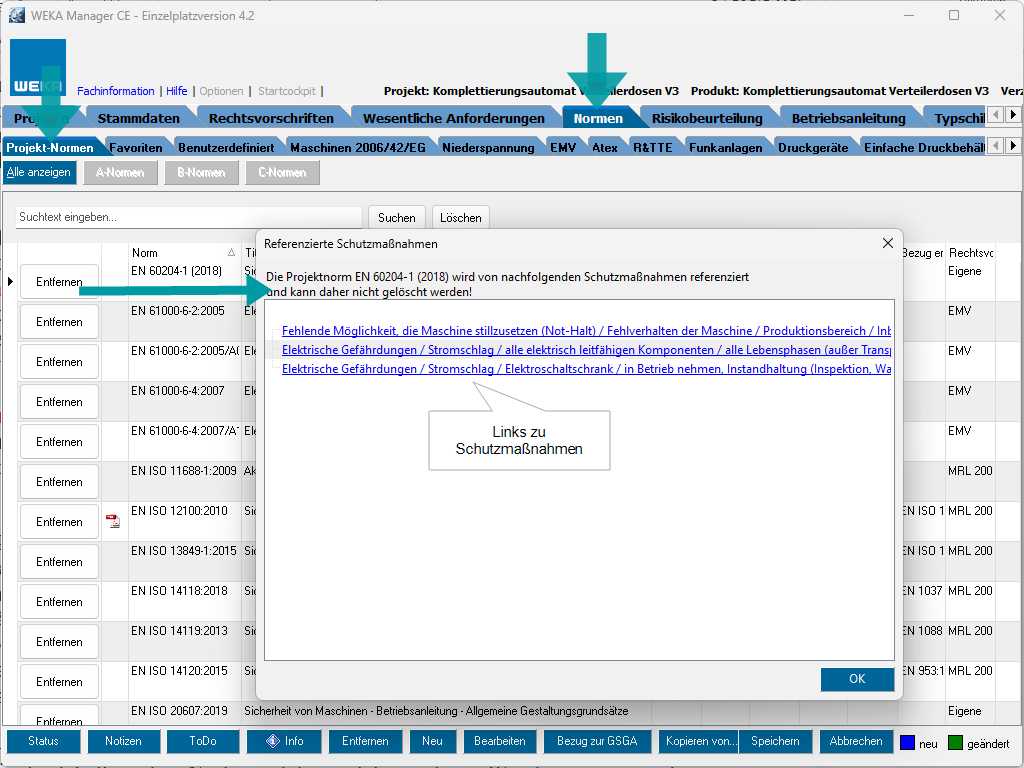 Ab Version 4.2 werden Verknüpfungen von Projekt-Normen zu Schutzmaßnahmen in der Risikobeurteilung automatisch angezeigt, wenn eine Projekt-Norm im Register Projekt-Normen entfernt werden soll.