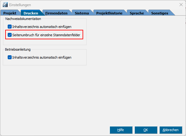 Eine neue Option sorgt standardmäßig dafür, dass bei der Ausgabe der Nachweisdokumentation die Stammdaten durch Seitenumbrüche getrennt werden. Diese Option ist eine globale Funktion, die sowohl bei der Ausgabe der Nachweisdokumentation in tabellarischer Form als auch bei der Nachweisdokumentation Fließtext greift.