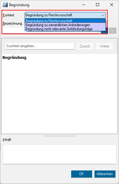 Die folgende Abbildung zeigt den Dialog Begründung mit der Auswahlliste auf andere Textbaustein-Kategorien.