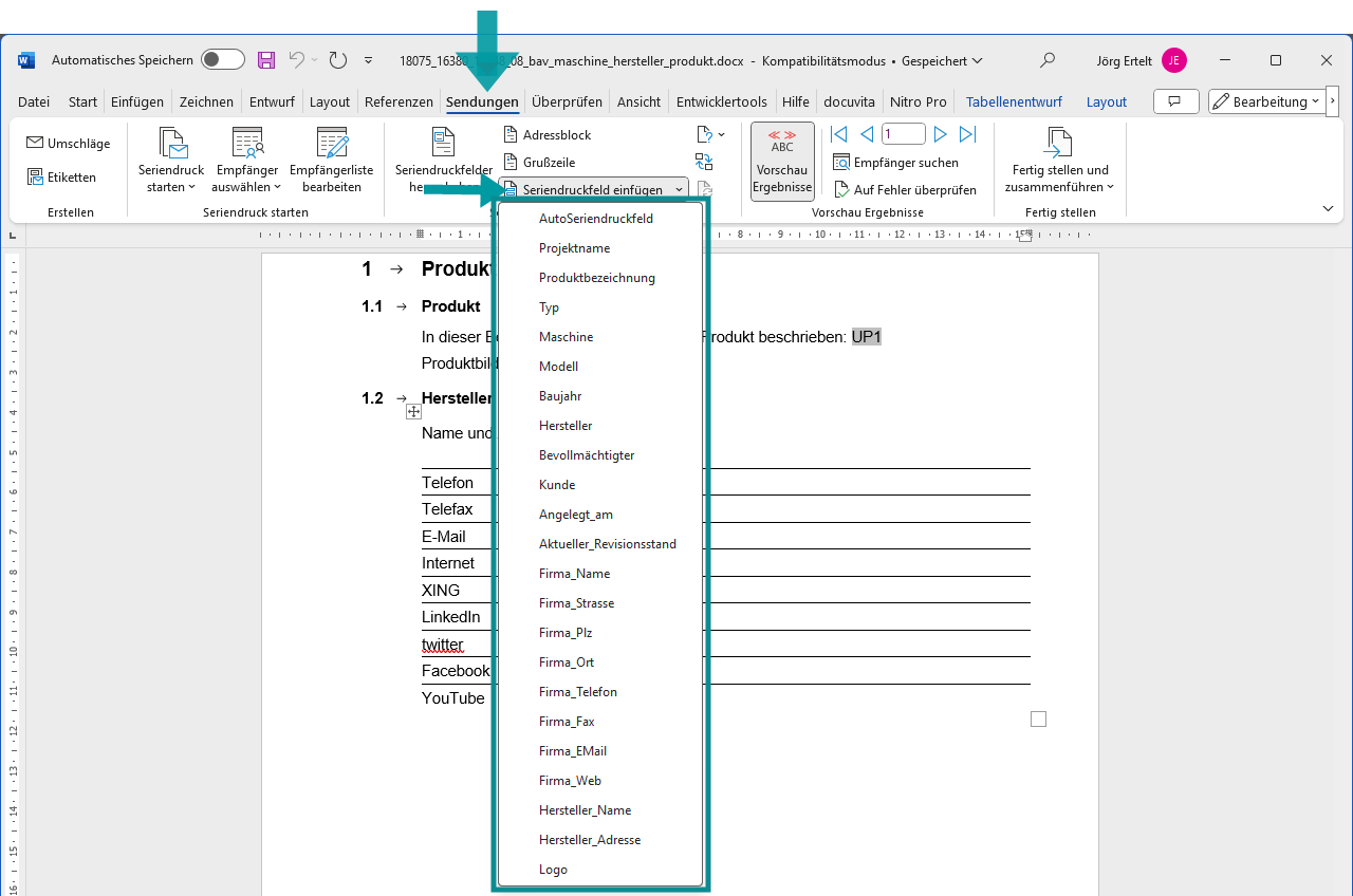 Bei der Erstellung der Betriebsanleitung im Register Betriebsanleitung können in Word-Dateien Platzhalter eingefügt werden: