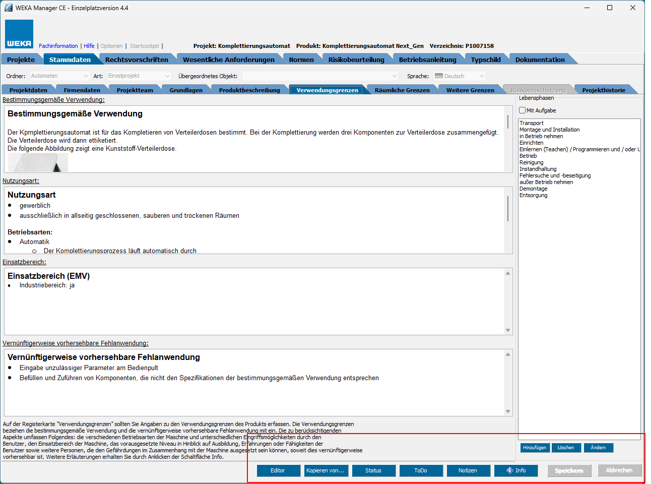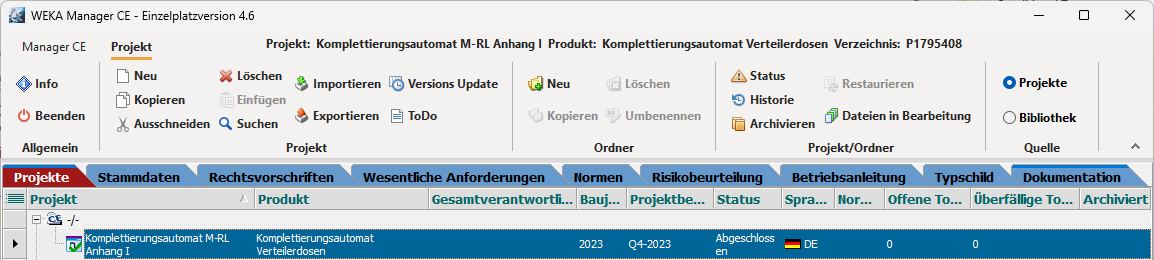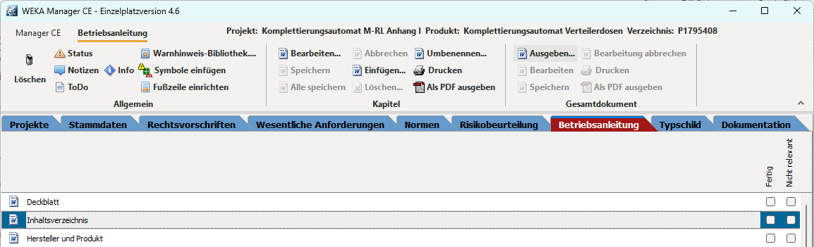Die in der Ribbon Bar enthaltenen Abschnitte mit Funktionen wechseln in Abhängigkeit des gewählten Registers, wie z. B. Register Stammdaten, Risikobeurteilung, Betriebsanleitung usw.