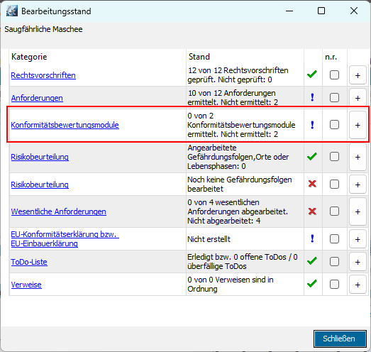 Die folgende Abbildung zeigt den Bearbeitungsstand eines Projekts mit der Kategorie Konformitätsbewertungsmodul und den verkürzten Kategorie-Bezeichnungen.