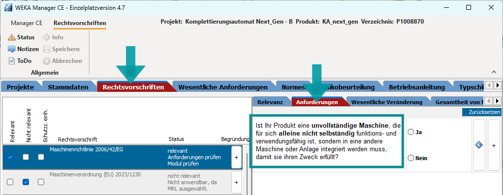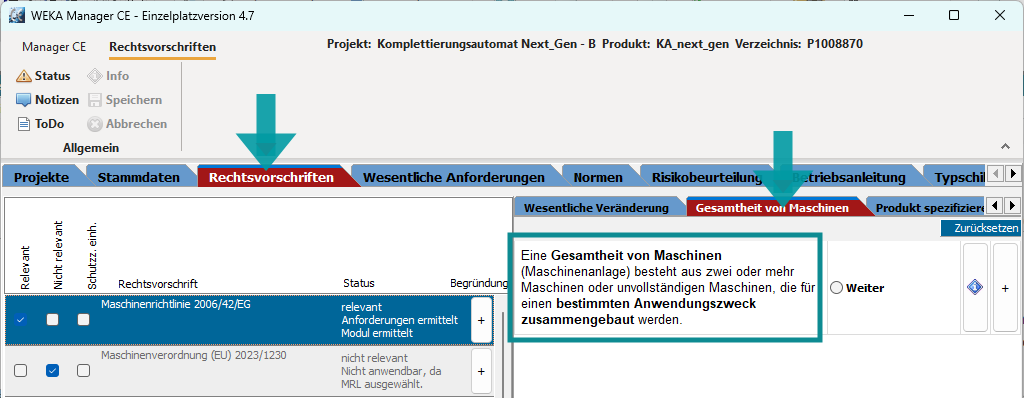Ab Version 4.7 wird auf die Maschinenverordnung (EU) 2023/1230 verwiesen.