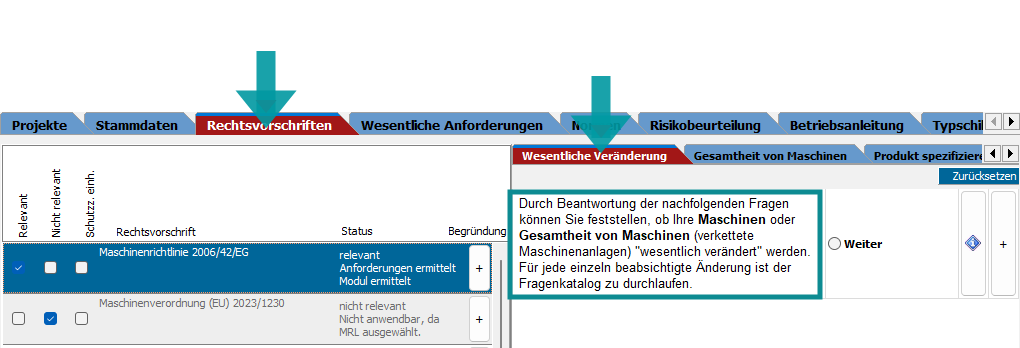 In den Frage-Antwort-Assistenten zur Maschinenrichtlinie 2006/42/EG wurden Schlüsselwörter hervorgehoben, damit Fragen schneller erfasst werden können. Dies betrifft die Frage-Antwort-Assistenten in den Registern Anforderungen, Wesentliche Veränderung und Gesamtheit der Maschinen